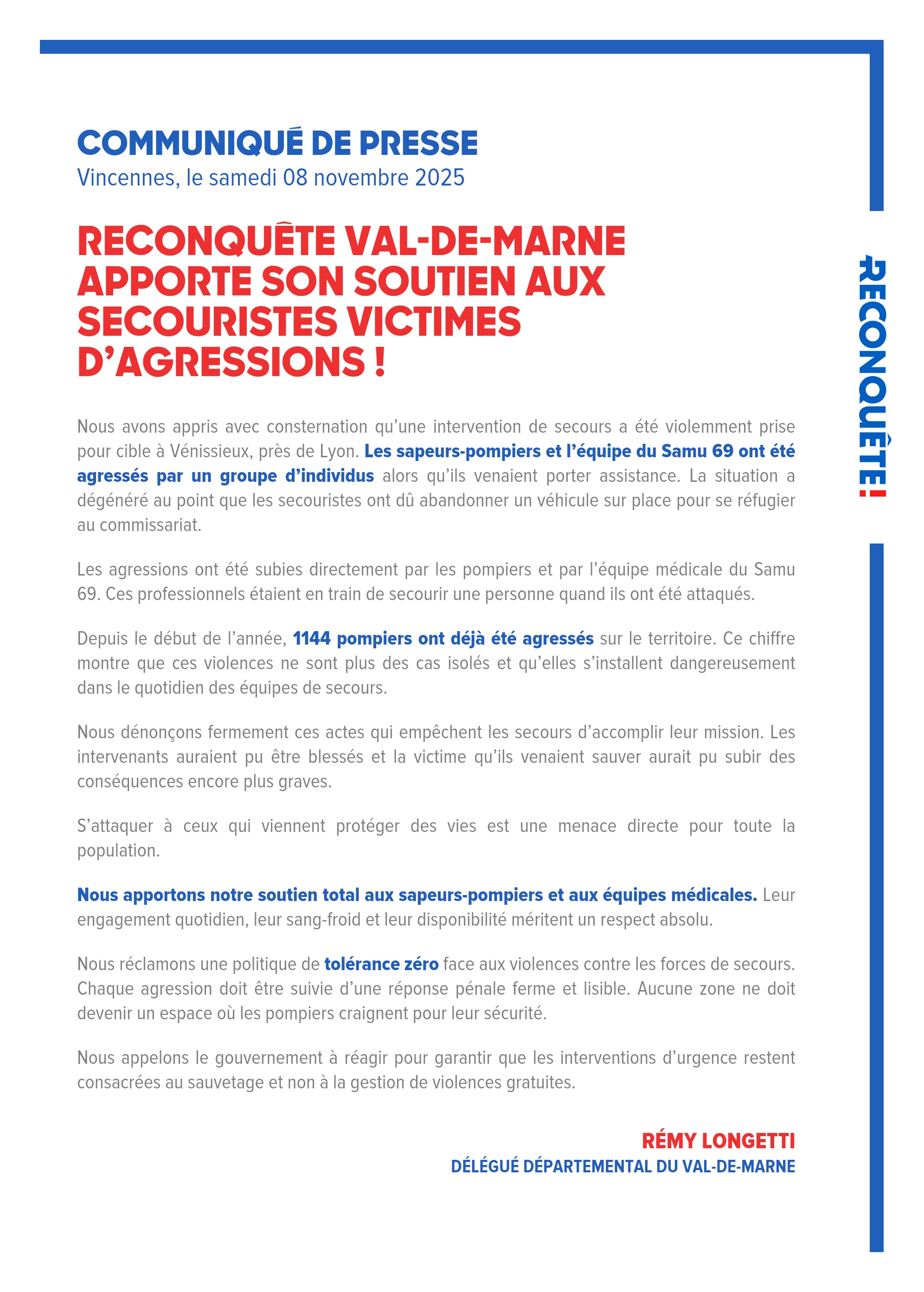 Reconquête Val-de-Marne apporte son soutien aux secouristes victimes d’agressions !